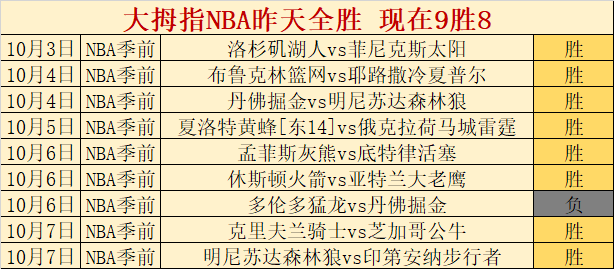 NBA昨天全胜,现在9胜8,新赛季的NBA发挥真的很精彩。昨天继续胜利,连胜4天,胜+7,近13胜10状态很好!