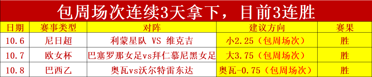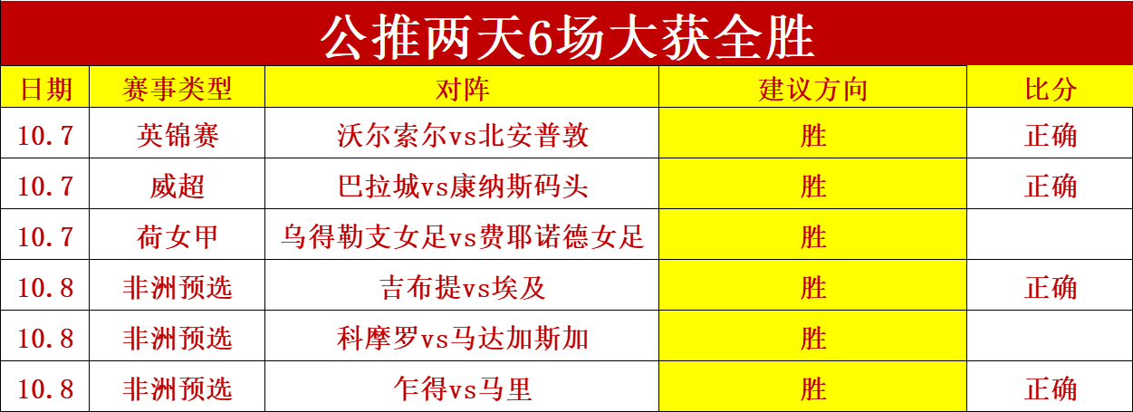 一、战绩回顾:昨天值得称赞的是公推3场再次大获全胜,连续两天全胜,目前公推6连胜,另外包周的场次再次顺利打出,连续3天拿下,今天强项欧洲预选。(温馨提醒:为了进一步提高精准度,经过团队深度研究,现在起发布的观点贴不会过早,会持续关注数据的变化才作出最终的判断,因为数据会随市场冷热度而做出调整,初始只能作为初步的参考,笔者会分为初始-中期-后期三个阶段进行全面的的分析)