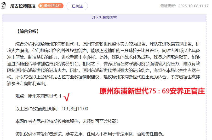 【成绩回顾】昨拿下二战胜,昨NBA也拿下胜利,今天情报数据再升级冲击连胜,尼古拉资深作者情报解读再有方法,信心强项情报解读连胜赛事再次出发,长期解读惊喜不断,此前作者创下4次双位数胜战绩,掌握着一手赛事资深情报,本期继续分享充满奇妙体育赛事,敬请大家持续关注!!